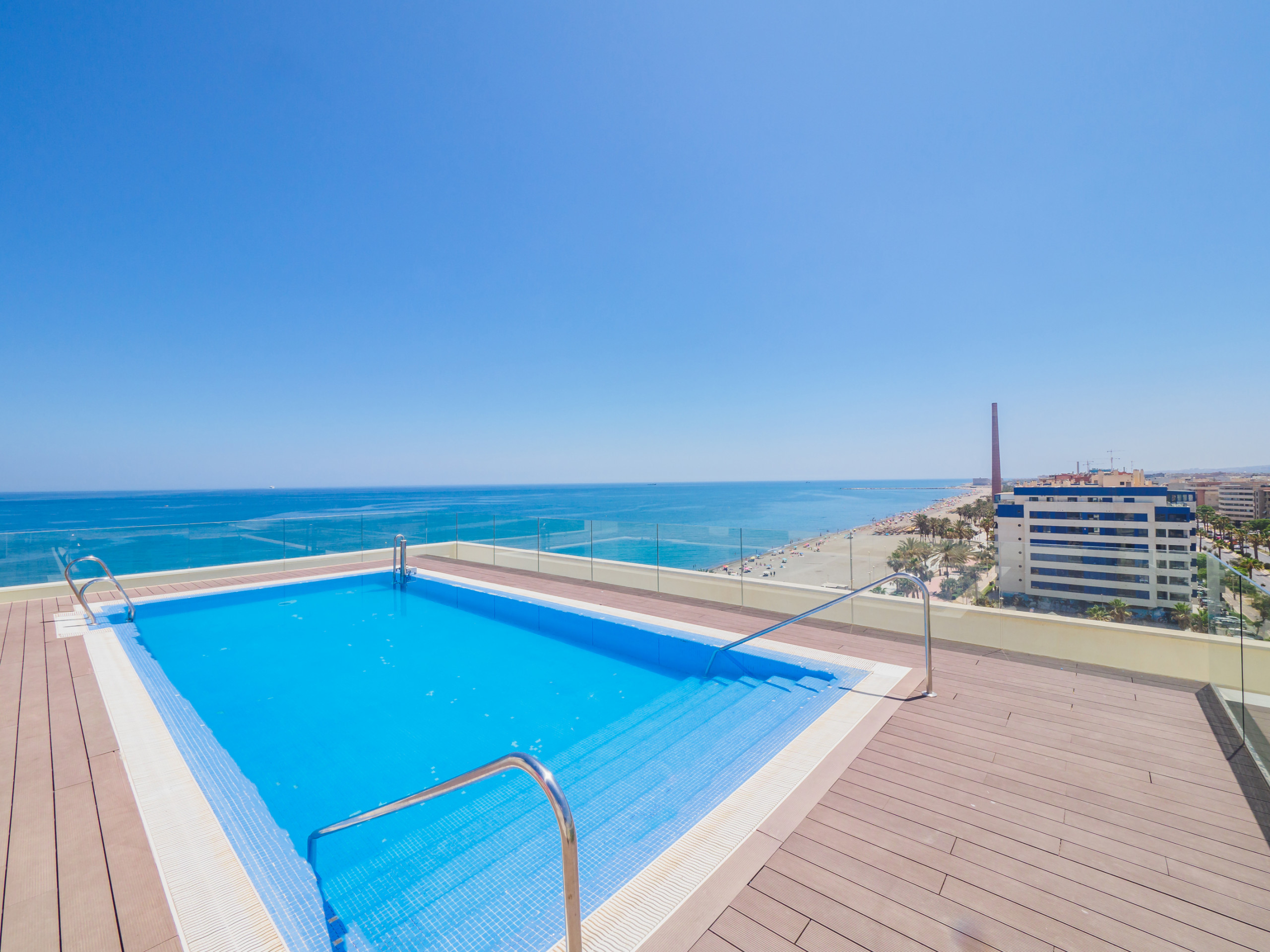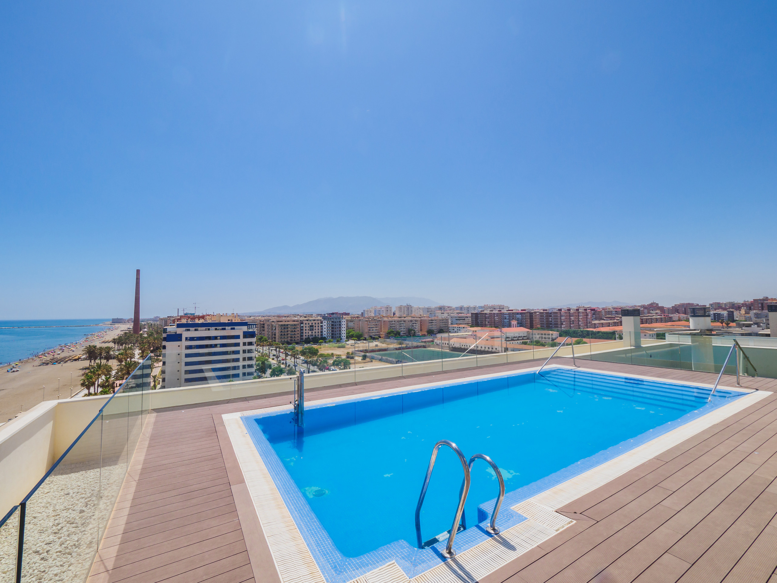 Right on the beach in Malaga, everything you need for a short break is here. A rooftop pool, beach downstairs and it's a short walk to a wide range of restaurants and supermarkets. Free parking and lots of scooter hire points nearby, you can explore the city and further afield in Andalucia or just relax by the pool.
