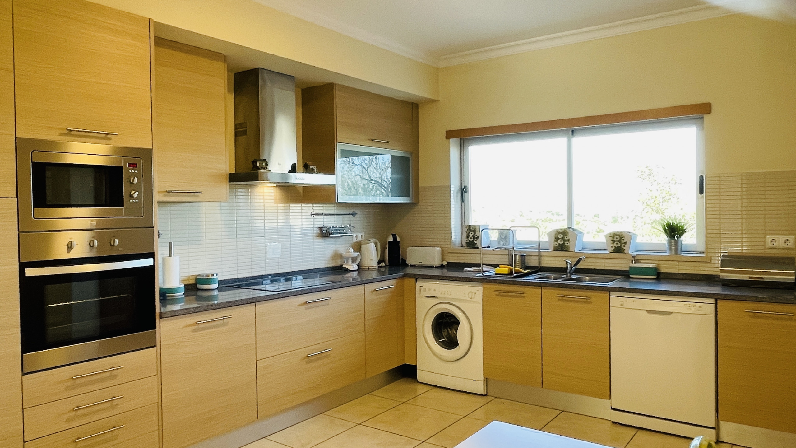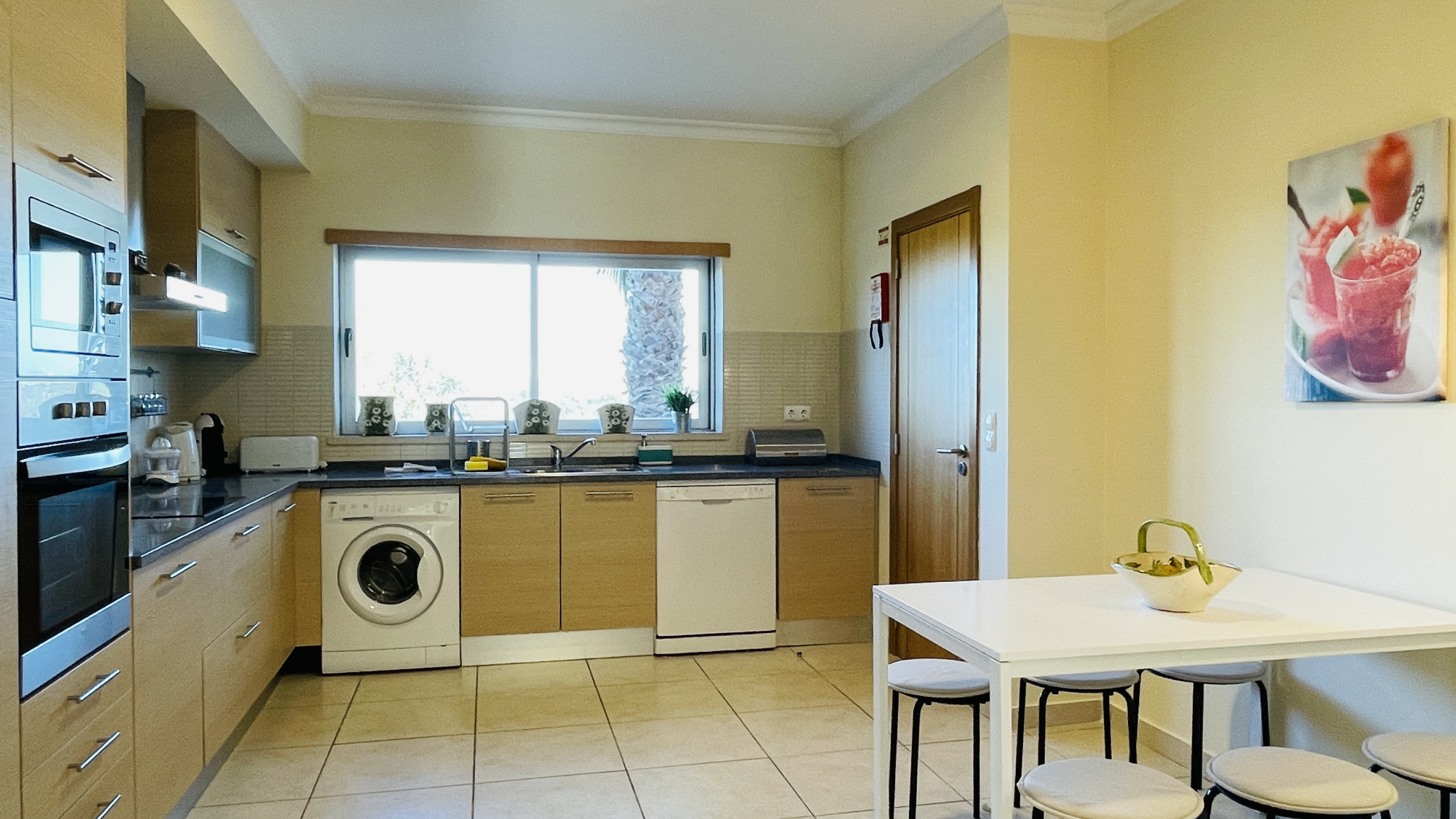 COZINHA: A cozinha é independente e totalmente equipada com todas as comodidades modernas, incluindo frigorífico, microondas, forno, máquina de lavar roupa, máquina de lavar louça, além de utensílios de cozinha essenciais como cafeteira, torradeira e jarro elétrico.