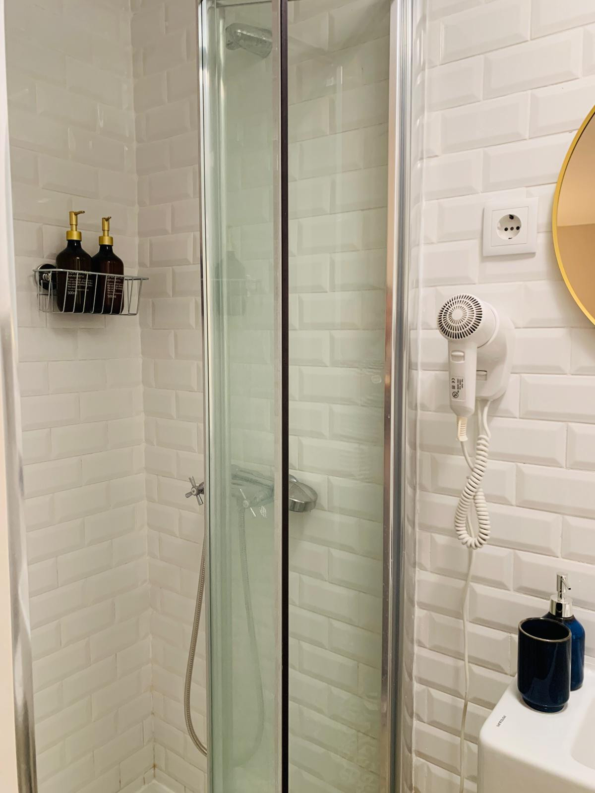 Casa de banho: Casa de banho moderna com chuveiro, toalhas frescas, secador de cabelo e essenciais.