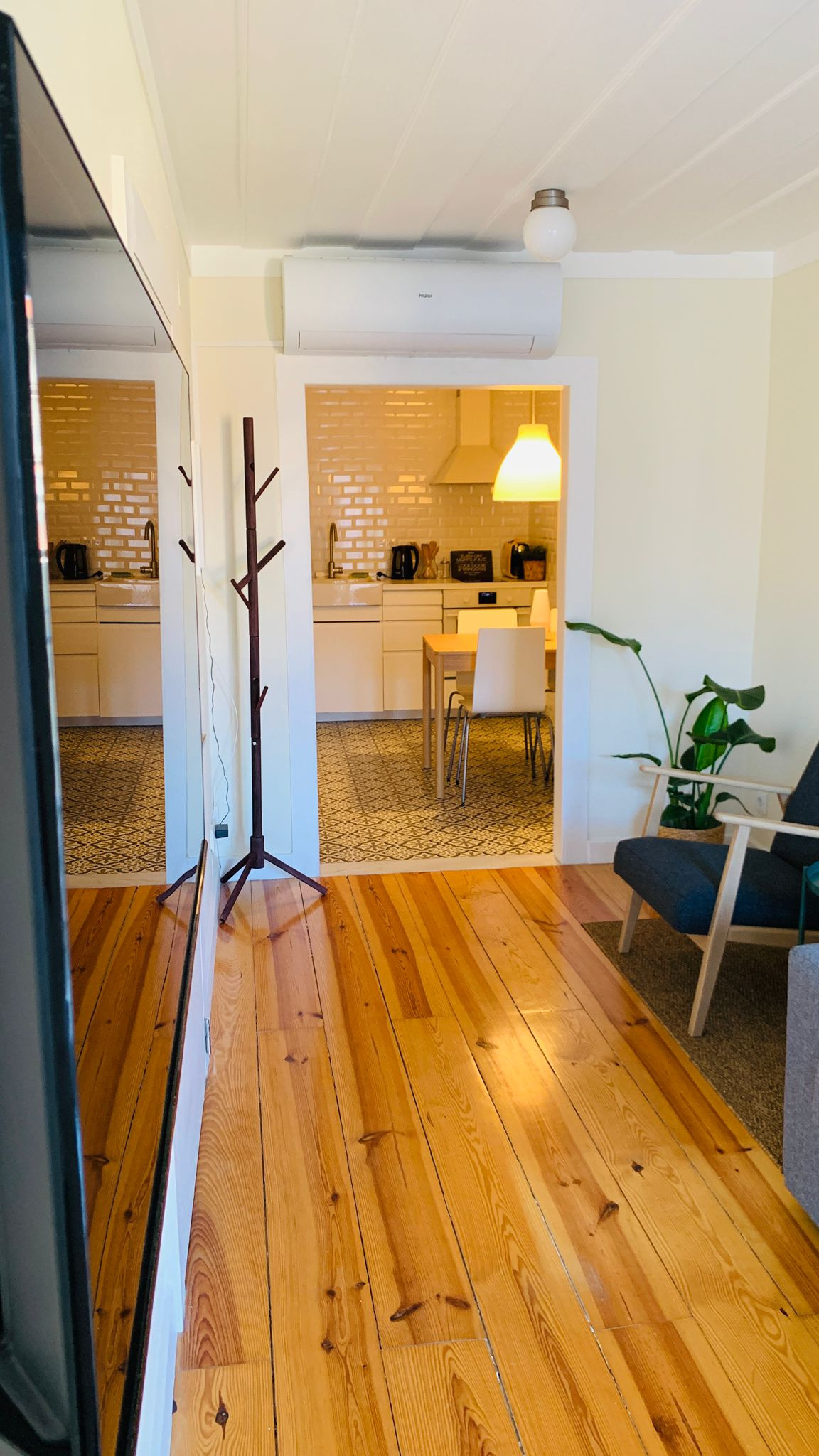 Extras: ar condicionado e aquecimento potentes, um ferro e tábua de passar, e um pavimento tradicional de varanda que enche o apartamento de luz natural.