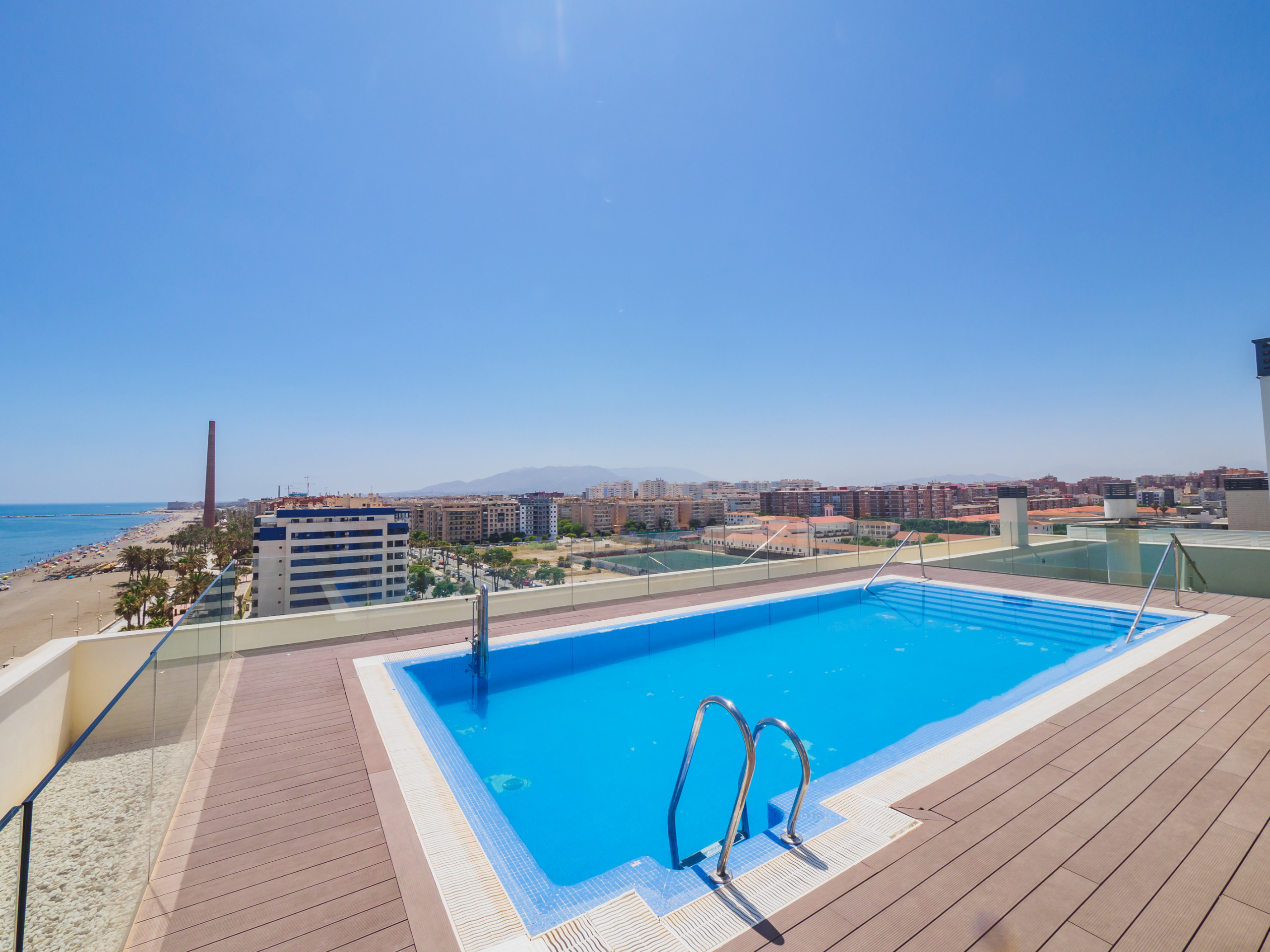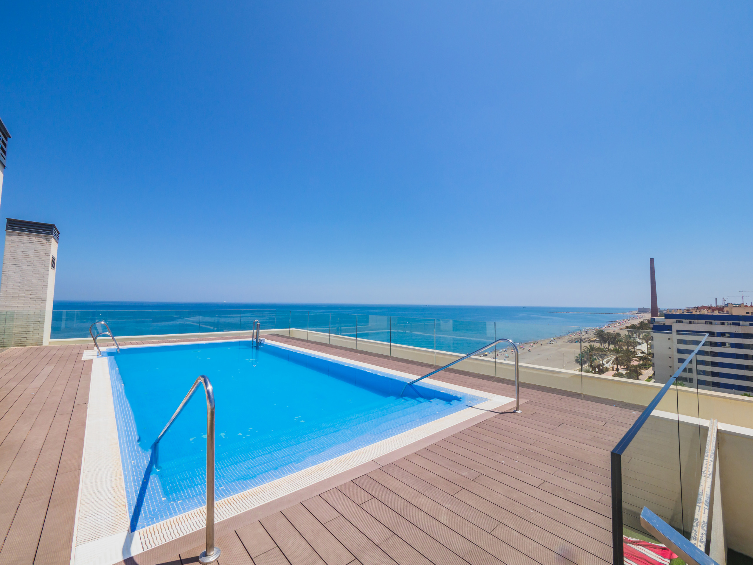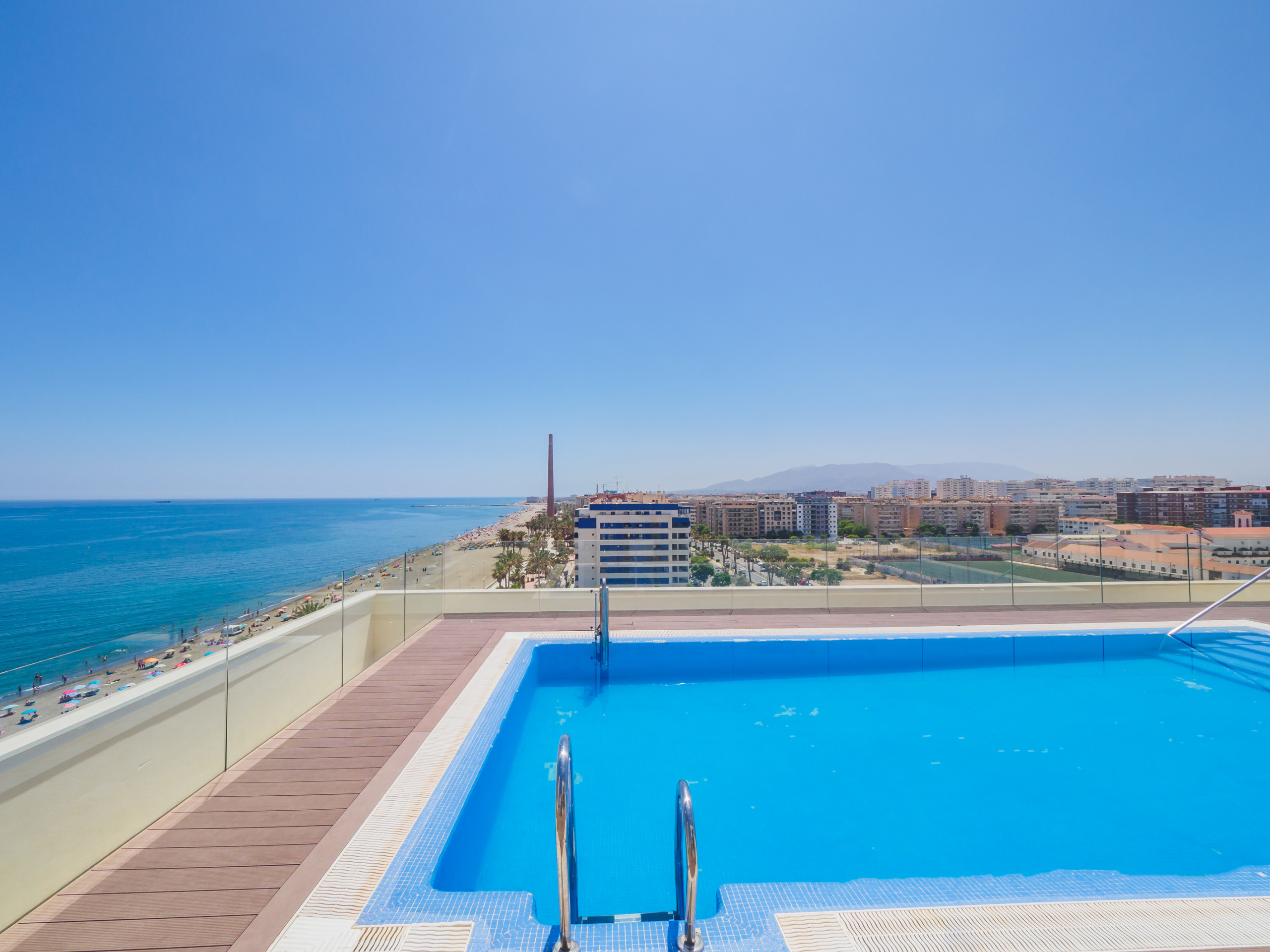 Right on the beach in Malaga, everything you need for a short break is here. A rooftop pool, beach downstairs and it's a short walk to a wide range of restaurants and supermarkets. Free parking and lots of scooter hire points nearby, you can explore the city and further afield in Andalucia or just relax by the pool.