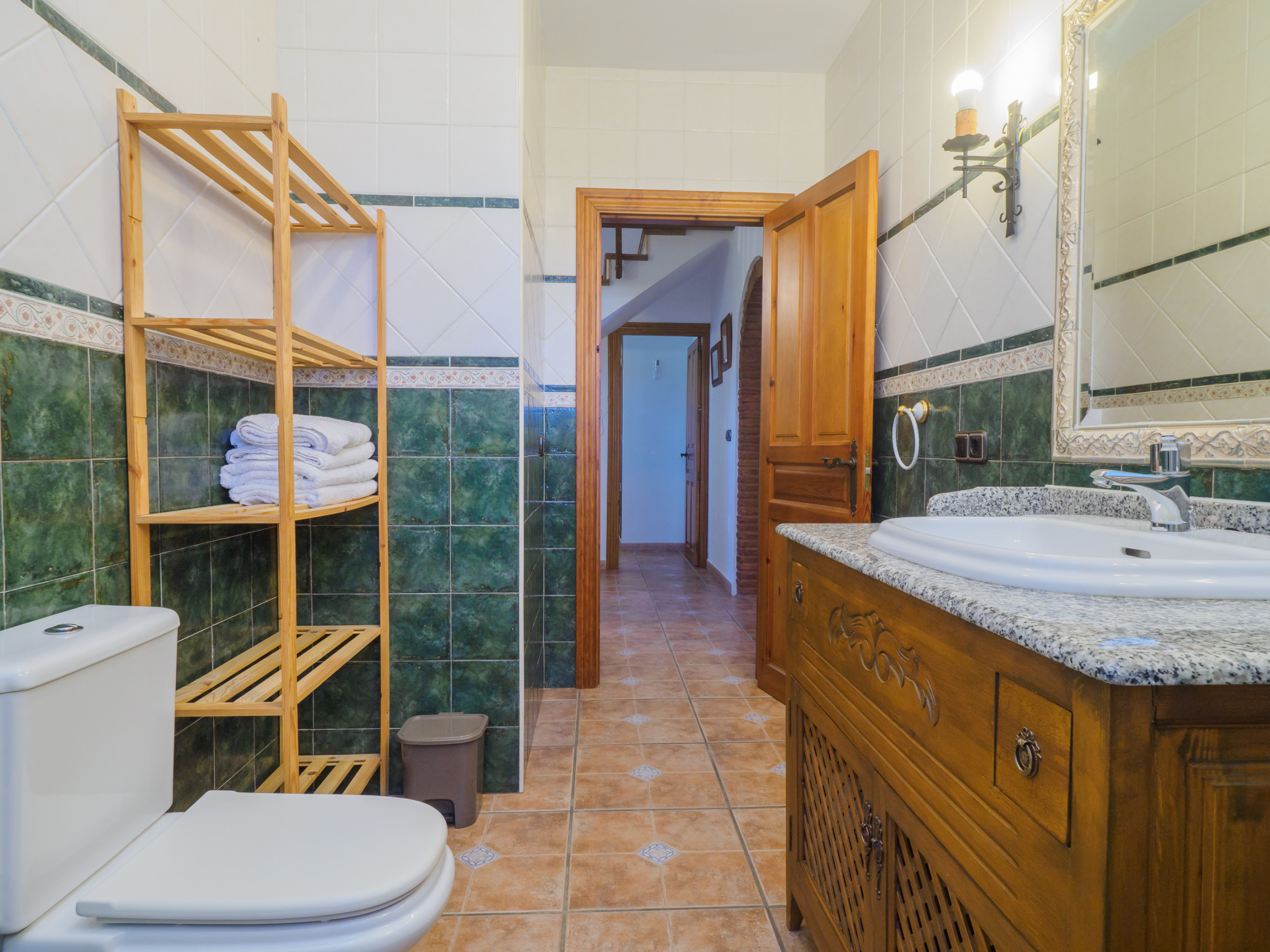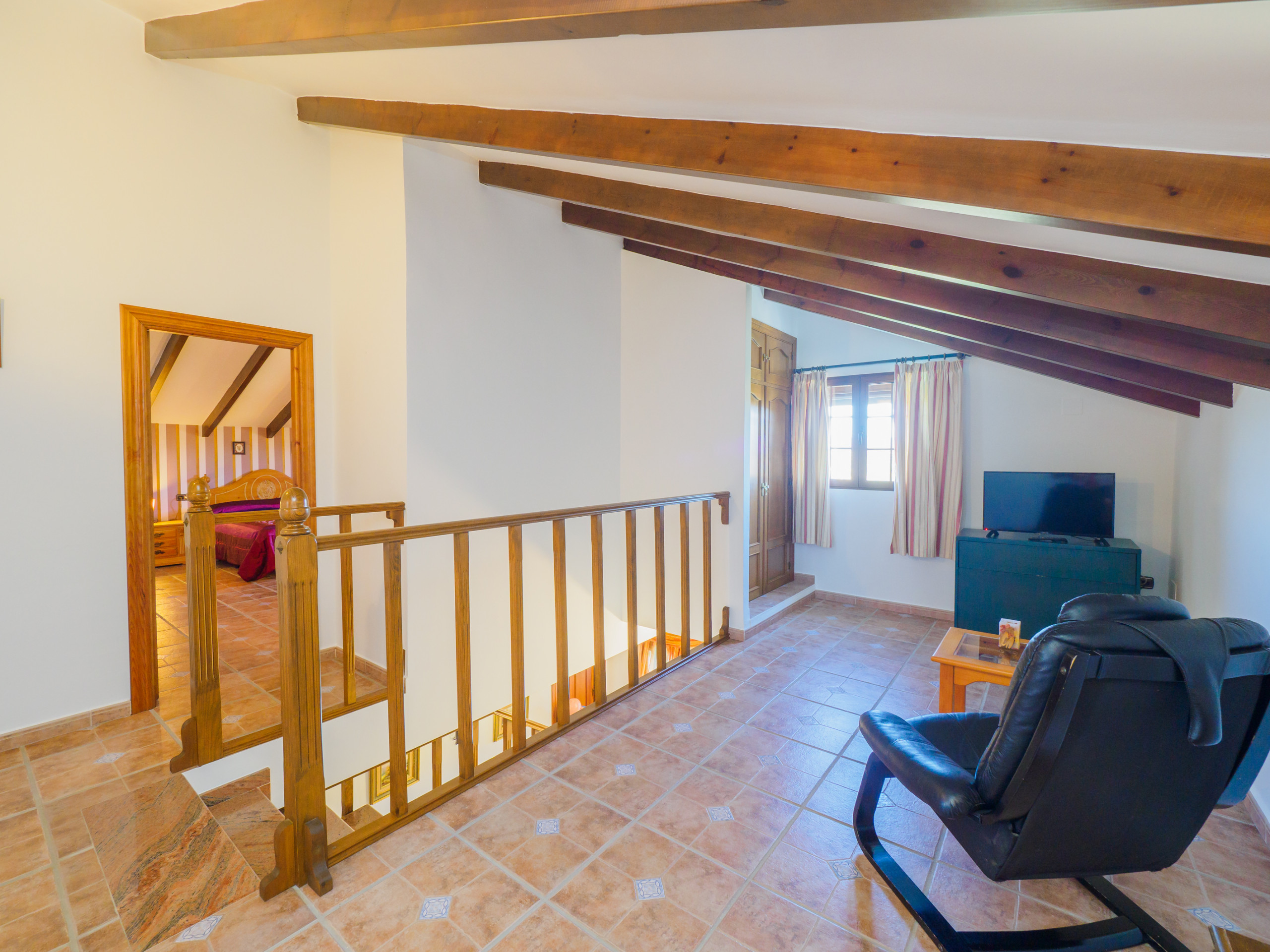 Climbing up a comfortable staircase, the upper floor offers a perfect relaxation space to read, chat or work with free wifi connection. Here you will find two spacious bedrooms with attic ceilings, which share a dressing room and a full bathroom. One of these bedrooms has a double bed and the other has two single beds, providing a rural and cosy environment for a restorative rest. 🛏️📚