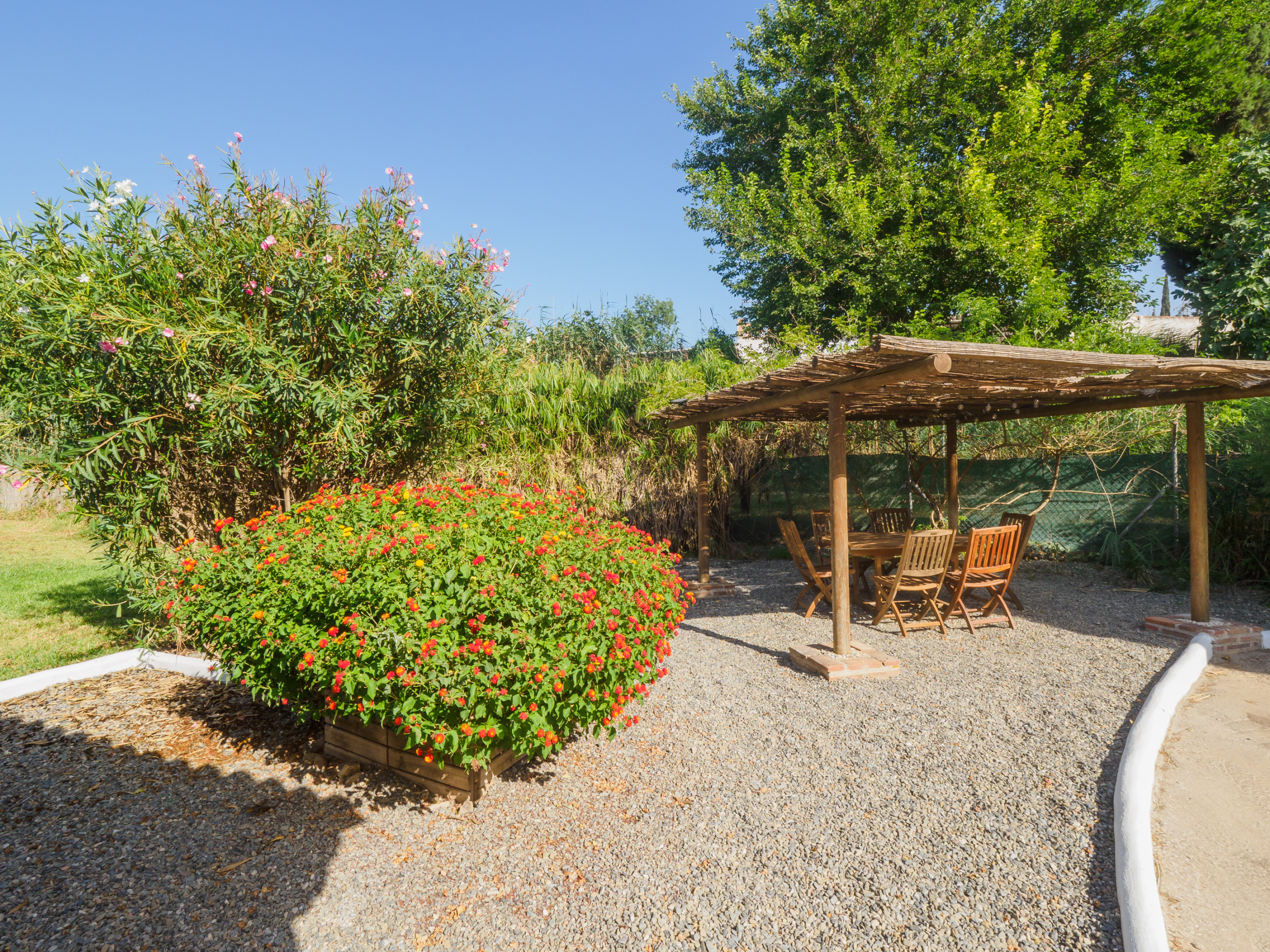 The exteriors are a true oasis, divided into two zones: one with a swimming pool and another with a pergola equipped with a dining table, perfect for lunches and family gatherings outdoors under the sun. In addition, the garden furniture and loungers invite relaxation and enjoyment of good weather.