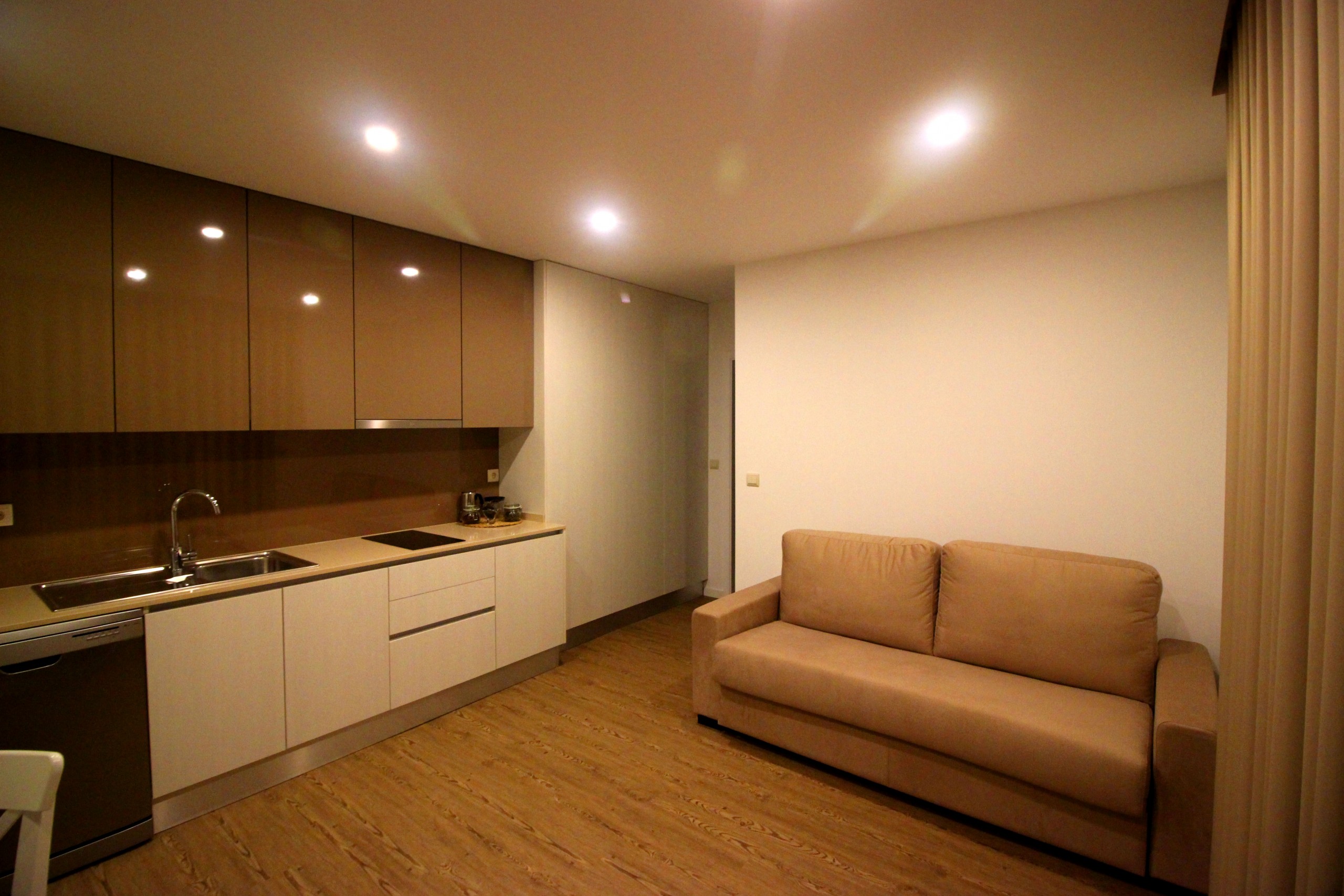 In the electric kitchen, refrigerator, microwave, dishwasher, dishes/cutlery, kitchen utensils and coffee machine are provided.